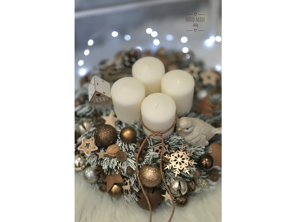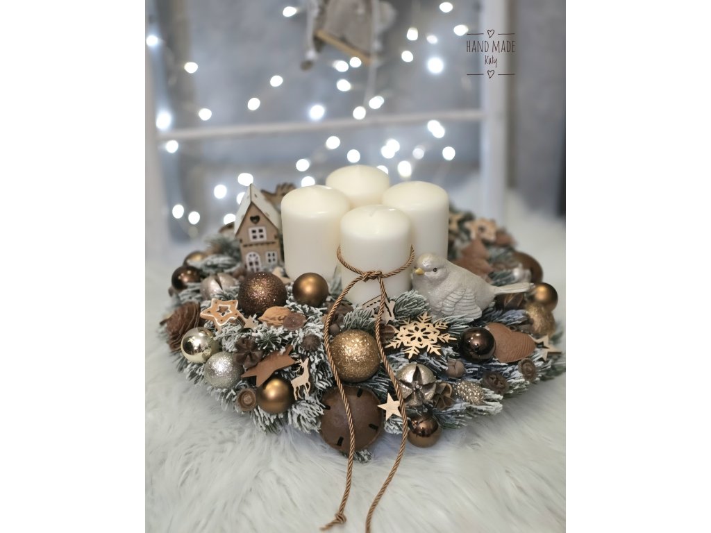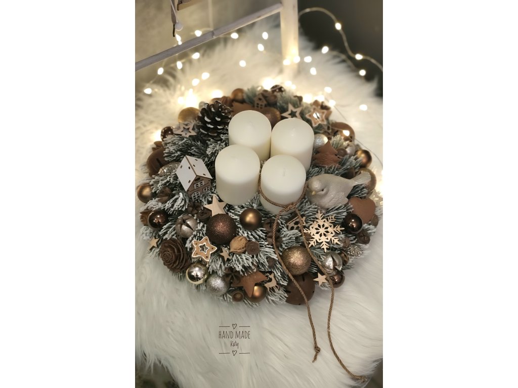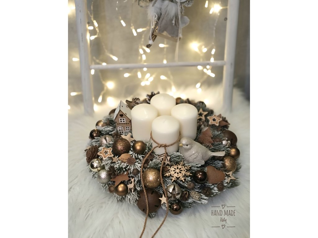 svietnik v hnedo, zlatých farbách. Veniec je na drevennom plate. Sviečky sú na bodoch.