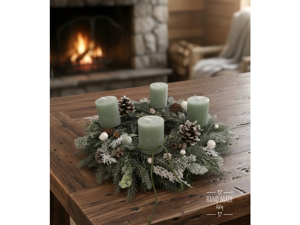 Adventný veniec naarazovany na kvalitnom základnom venci z 3D cecinky,,s namrazou. Na Sviečky sú bodce.