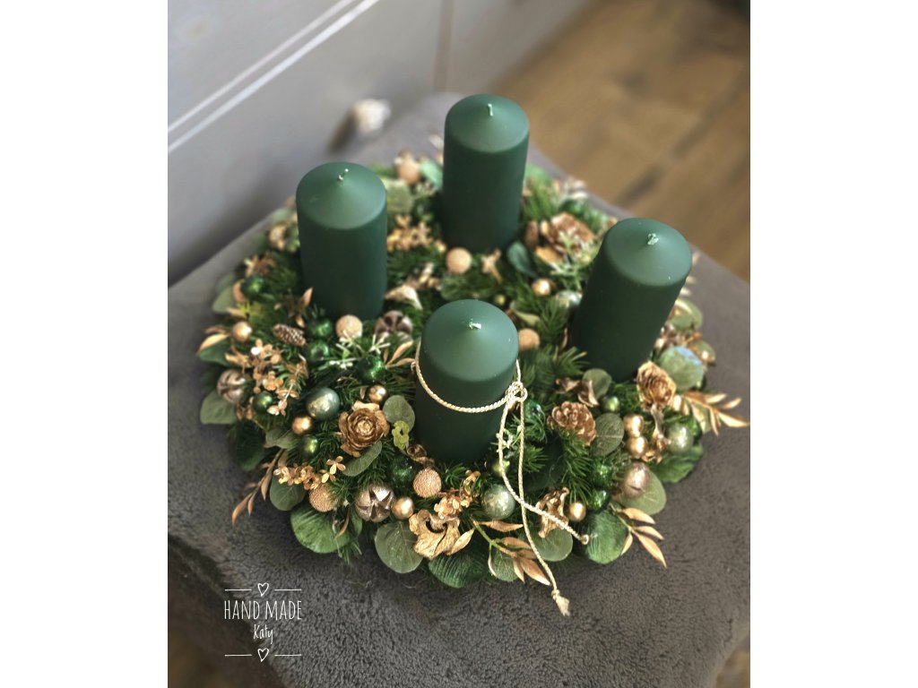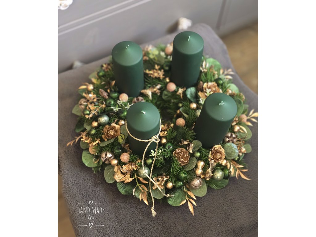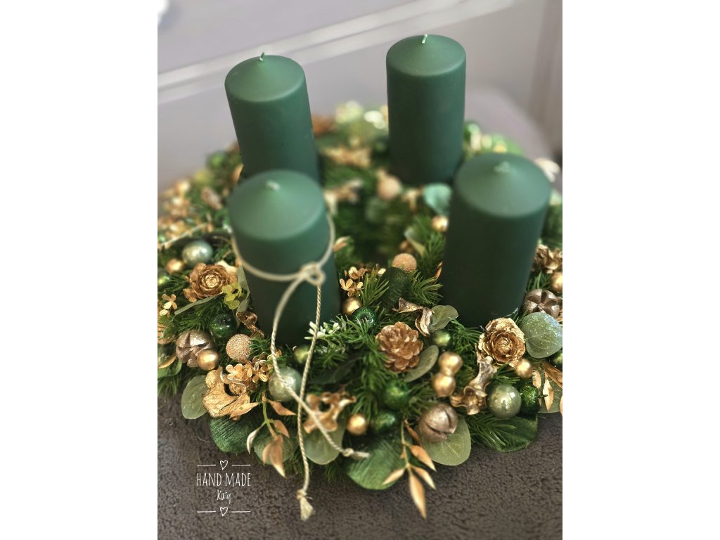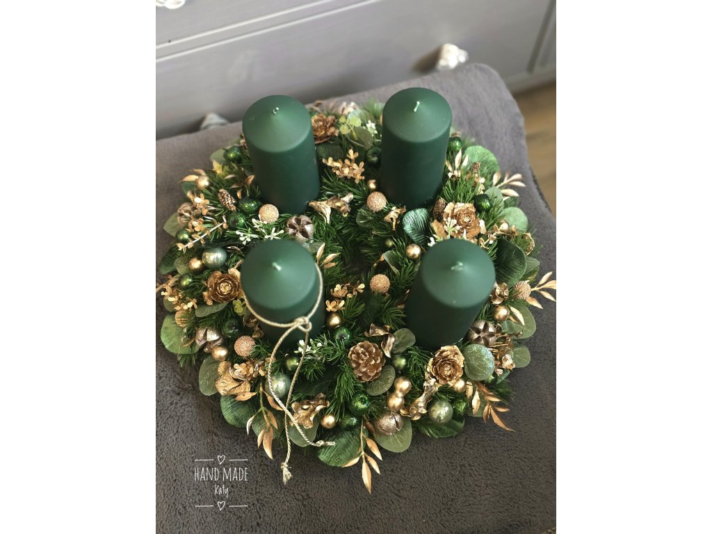 Adventný veniec naarazovany na kvalitnom základnom venci s 3D cecinky. V krásnych smaragdovo zlatých farbách s eukalyptom.
