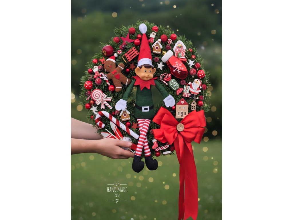 Vianocny veniec so skriatkom a veľkou mašľou naarazovany na kvalitnom základnom venci z 3D cecinky.