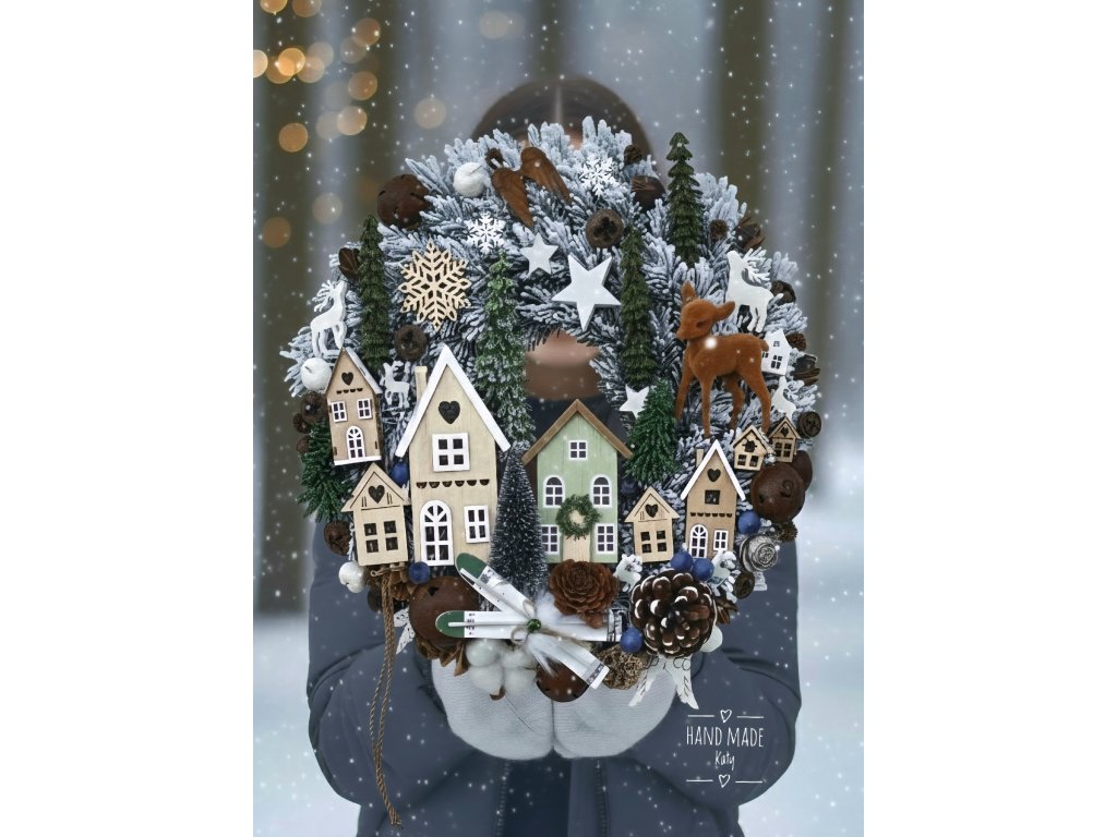 Zimný veniec naarazovany na kvalitnom základnom venci. Zo zadnej strany je uško na spagatik alebo stužku.